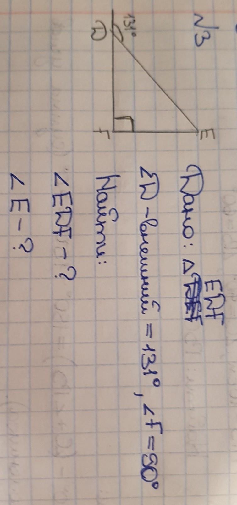 угол ЕDF будет равен 49°, т.к. он смежный с внешним углом, 180° - 131°=49°