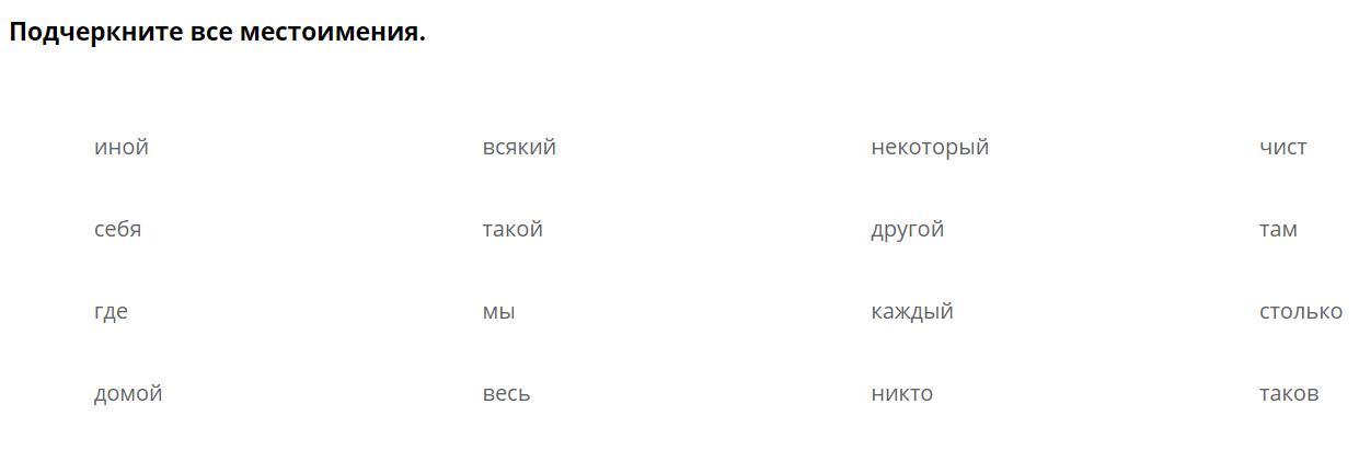 местоимения:иной , всякий,некоторый,себя ,такой,другой,там,где, мы ,каждый,столько , весь,никто ,таков