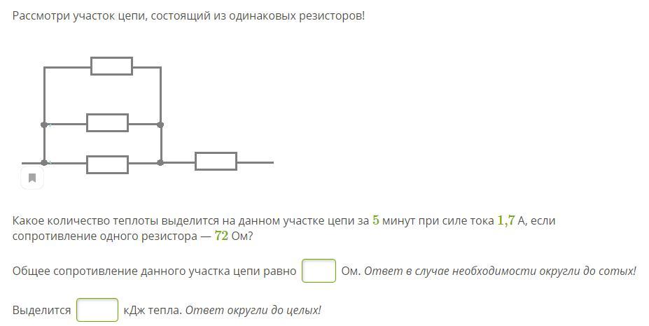 Какое количество теплоты выделится на данном участке цепи за 5 минут при силе тока 1,7 А, если сопротивление одного резистора — 72 Ом?
