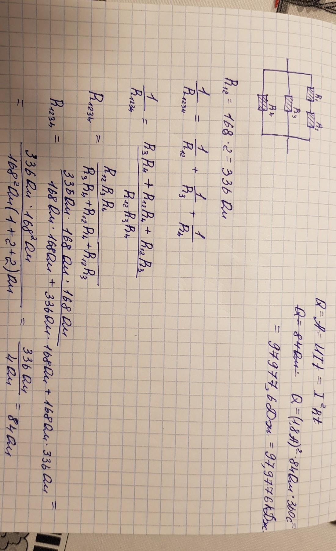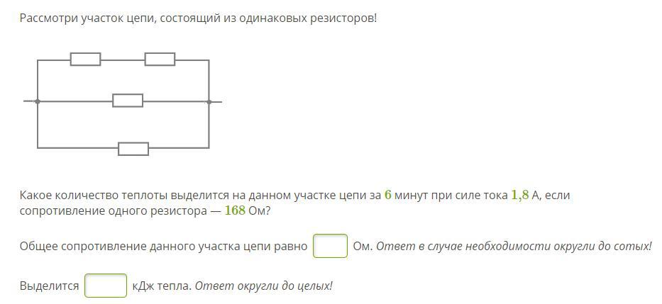 Какое количество теплоты выделится на данном участке цепи за 6 минут при силе тока 1,8 А, если сопротивление одного резистора — 168 Ом?