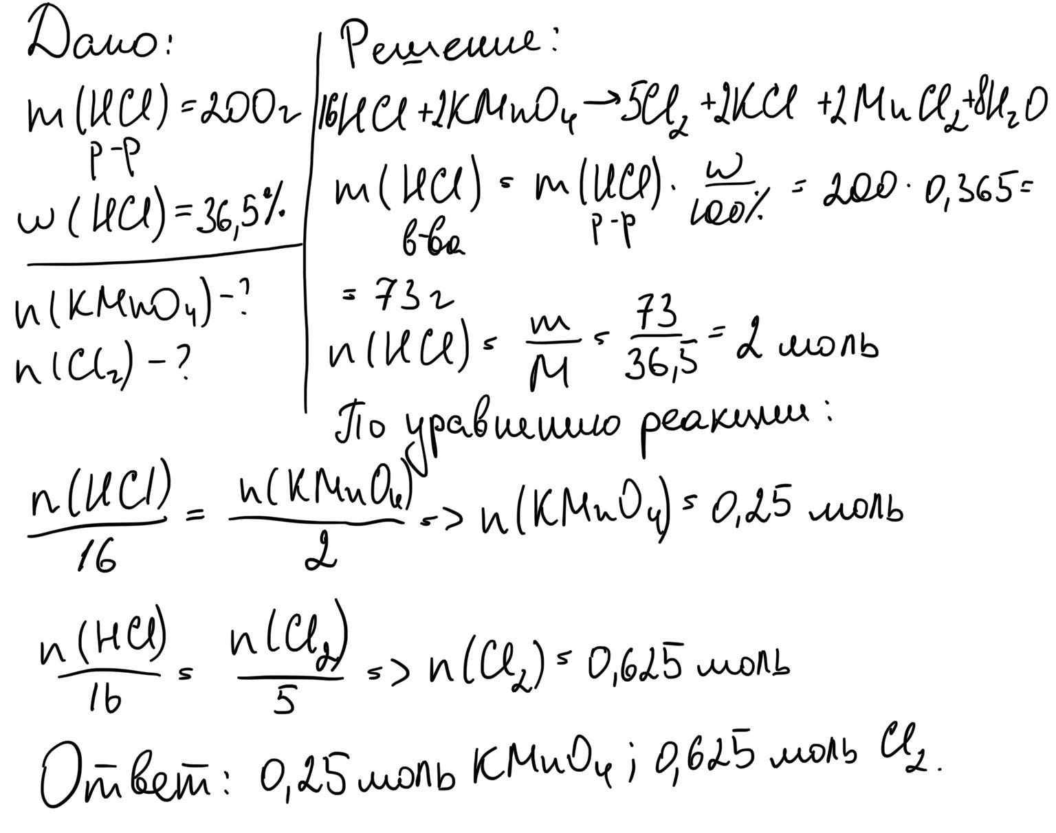 Сколько молей окислителя вступило в реакцию и какое количество моль газа образовалось в результате взаимодействия 200 г 36,5% раствора хлористоводородной кислоты с перманганатом калия. Пожалуйста помогите