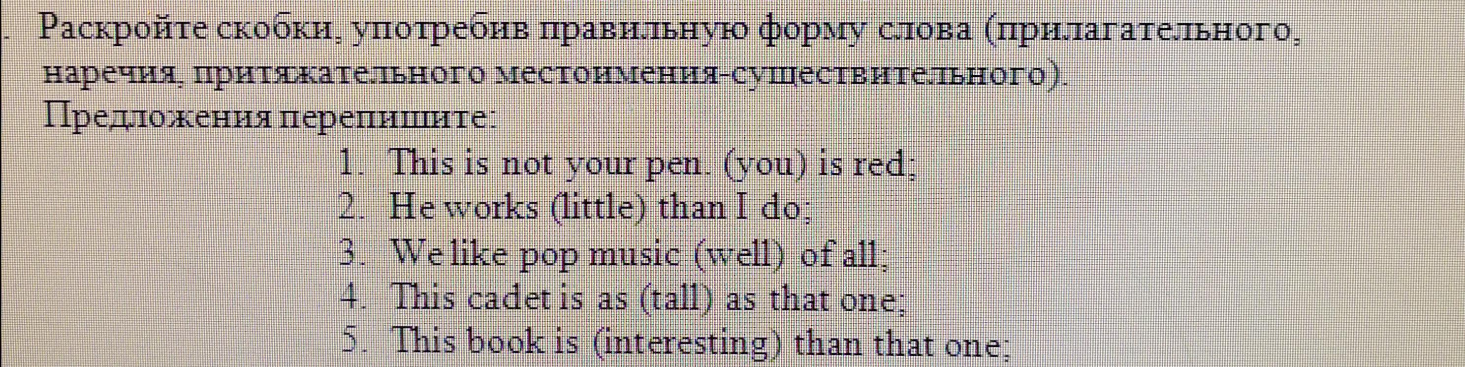 Ответ: your is red. He works less than I do. We like pop music most of all. This cadet is as tall as that one. This book is interesting than that one ( в последних двух вроде бы не нужно менять )