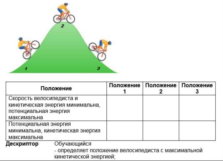 Определите и заполните в таблицу каким видом энергии обладает велосипедист в положениях 1, 2 и 3.