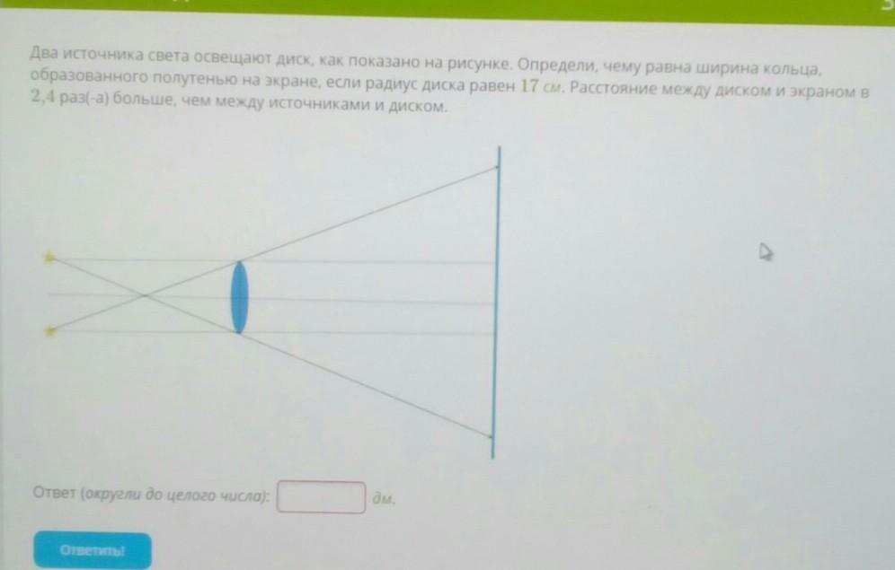 Два источника света освещают диск, как показано на рисунке. Определи, чему равна ширина кольца,