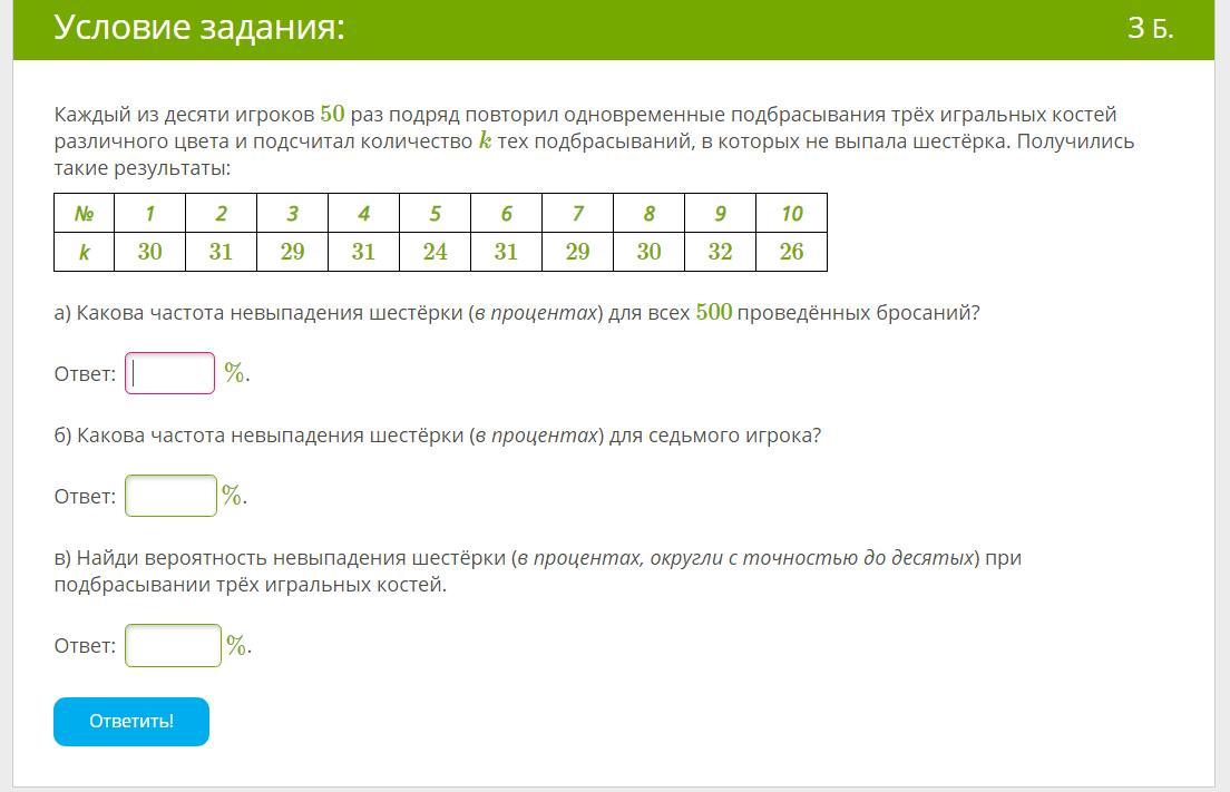 Каждый из десяти игроков 50 раз подряд повторил одновременные подбрасывания трёх игральных костей различного цвета и подсчитал количество k тех подбрасываний, в которых не выпала шестёрка. Получились такие результаты: