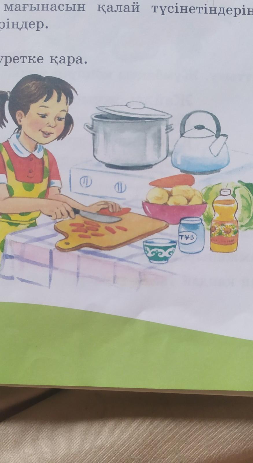Айнаның анасы жұмыста. Айна ата- анасының алдынан түскі ас дайындауға кірісті. Сəбізді, картөшкені аршып алды. Оларды жақсылап жуып, турады. Газ плитасына шай қойып, кəстөрелді отқа қойып, ішіне май құйып қойды. Туралған сəбіз, кəртөшкені, қырыққабатты тұзын салып дəмін келтіріп жақсылап қуыруға кірісті. Айна өзінің ата- анасына көмектесе алғанына қуанып, қуаныштан жүзі бал- бұл жайнады.