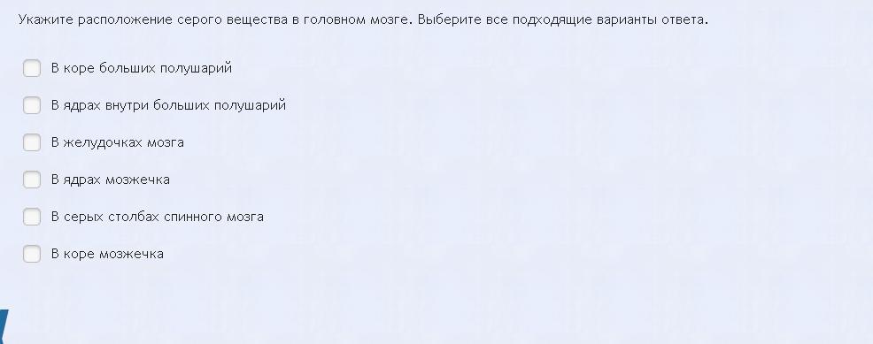 В КОРЕ БОЛЬШИХ ПОЛУШАРИЙ + В КОРЕ МОЗЖЕЧКА + В ЯДРАХ МОЗЖЕЧКА + В СЕРЫХ СТОЛБАХ СПИННОГО МОЗГА