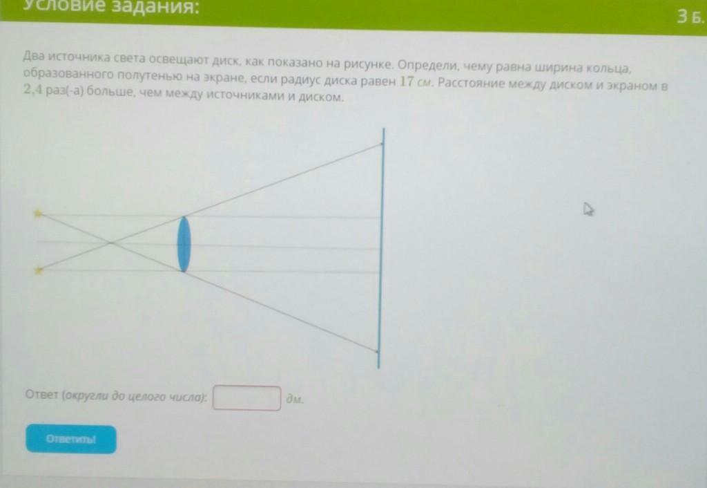 образованного полутенью на экране, если радиус диска равен 17 см. Расстояние между