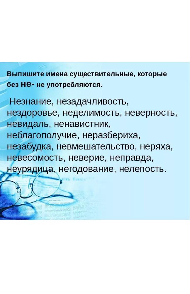 Неделимость, невидаль, ненавистник, неразбериха, незабудка, неряха, невесомость, неверие, негодование, нелепость.