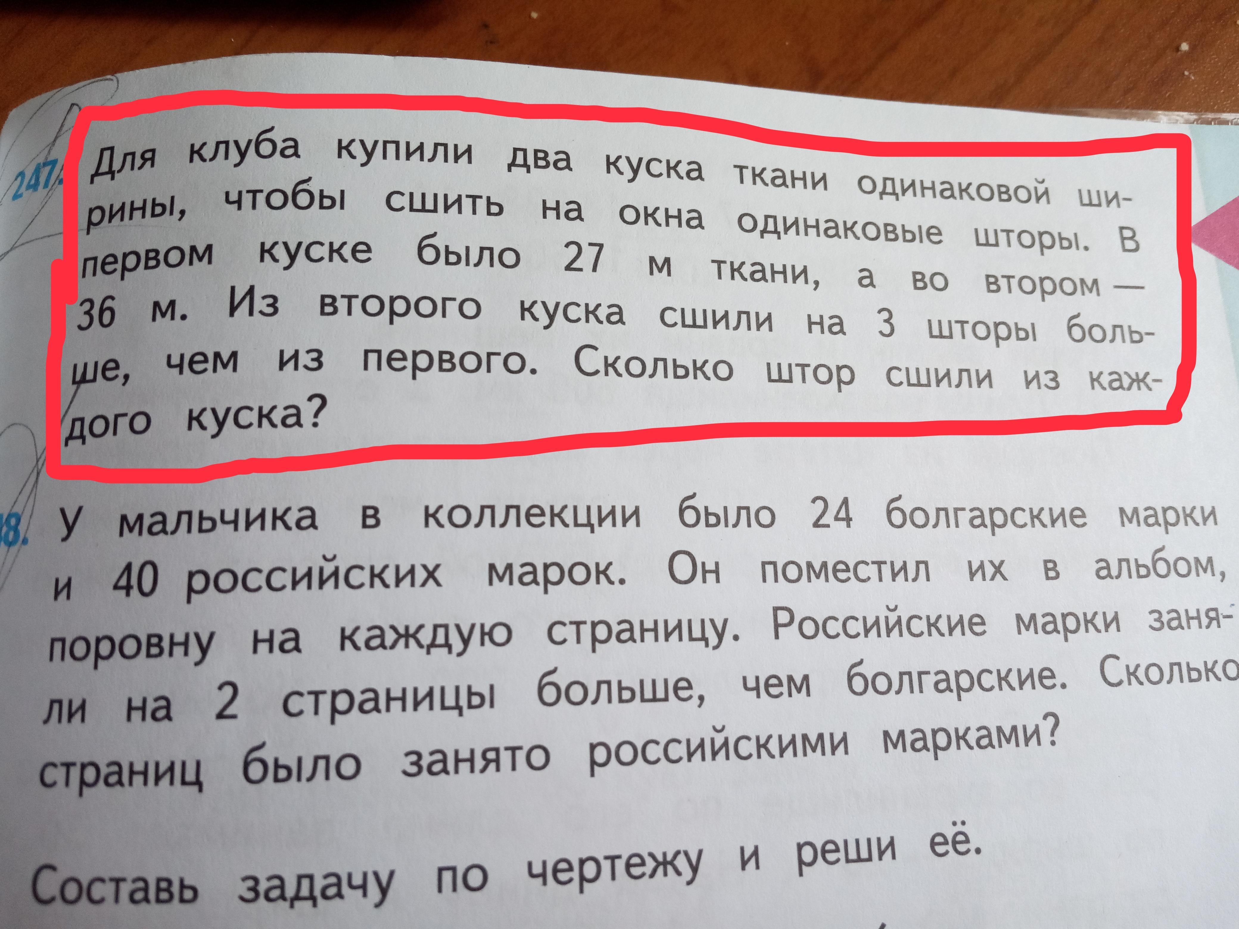 Смотри. Обозначим количество пошитых штор из первого куска за х.