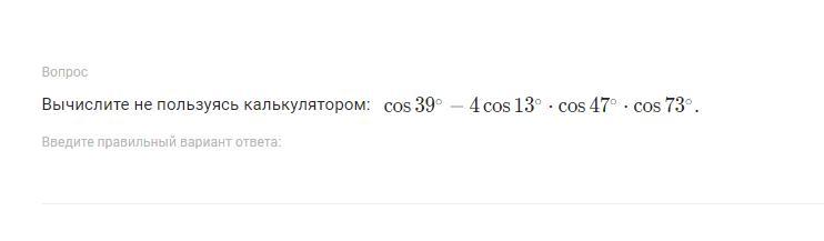 cos39-4*cos13*1/2*(cos(73-47)+cos(73+47)) = cos39-2*cos13*(cos26+cos120) = cos39-2*cos13*(cos26+cos(180-60)) = cos39-2*cos13*(cos26-1/2) = cos39-2*cos13*cos26+cos13 = cos39-2*1/2*(cos(39-26)+cos(39-26))+cos13 = cos39-cos13-cos39+cos13 = 0
