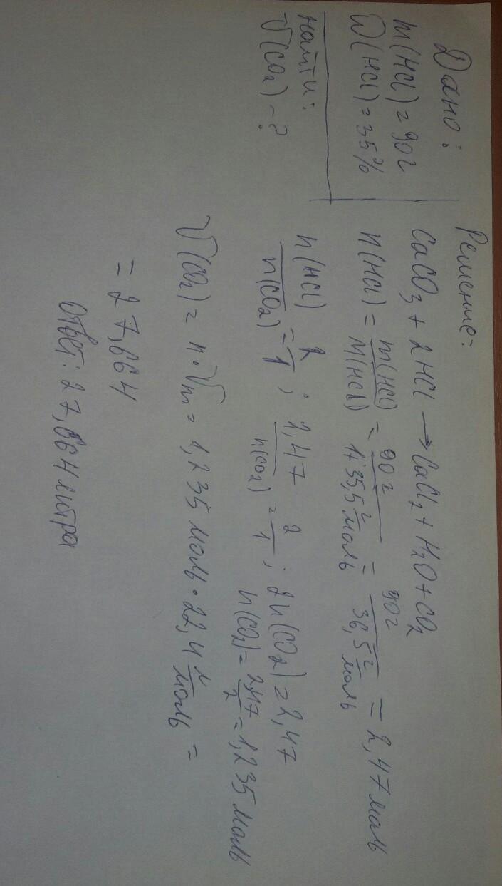 Помогите пожалуйста решить: Определите какой объём углекислого газа выделится при взаимодействии мела (CaCO3) c 90г 35% соляной кислотой. (CaCO3 + HCl = CaCl2 + H2O + CO2 , уравнение уравняете сами!) Даю 80 балов