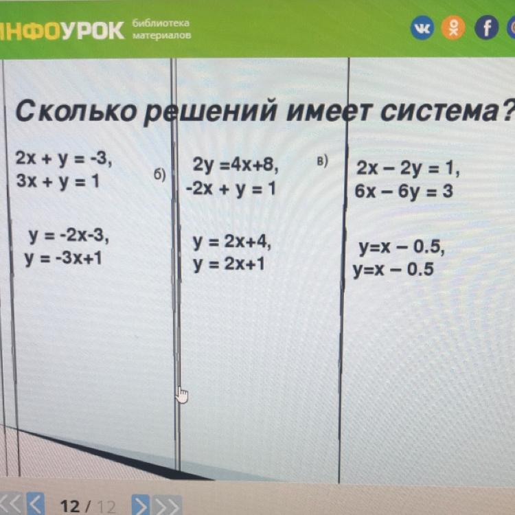 в) к₁=к₂, b₁= b₂ ⇒ прямые совпадают и решений бесконечное множество.