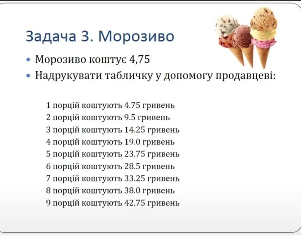 Потрібно надрукувати табличку у допомогу продавцеві. За допомогою ЦИКЛУ В ПАЙТОН!!!!!