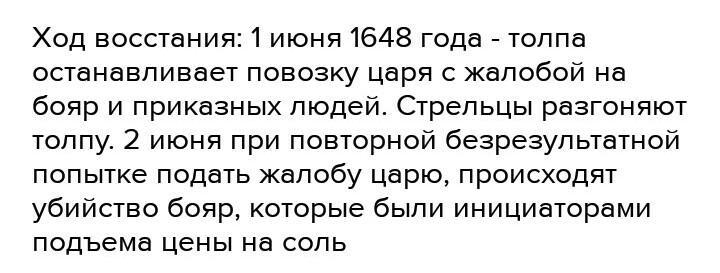 Ход восстания: 1 июня 1648 года - толпа останавливает повозку царя с жалобой на бояр и приказных людей. Стрельцы разгоняют толпу. 2 июня при повторной безрезультатной попытке подать жалобу царю, происходят убийство бояр, которые были инициаторами подъема цены на соль
