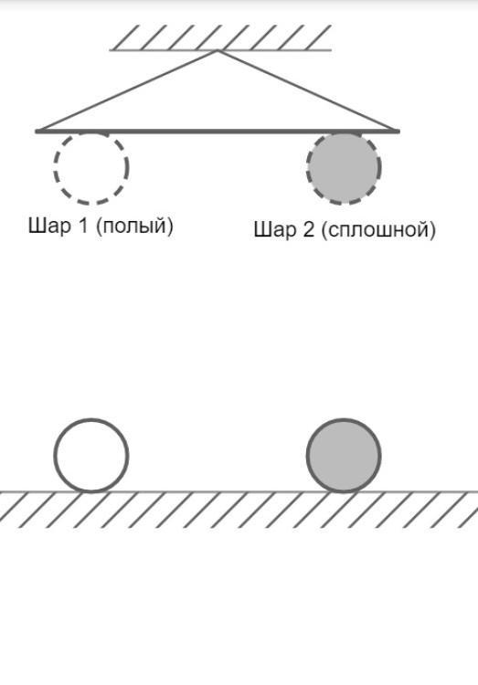 После выключения электромагнита чугунные шары 1 (полый) и 2 (сплошной) одинакового объёма упали с одной и той же высоты S на землю за один и тот же промежуток времени t Сравнить работу силы тяжести, совершённой над шарами, и развитую при этом мощность. Ускорение свободного падения равно g=10 м/с2