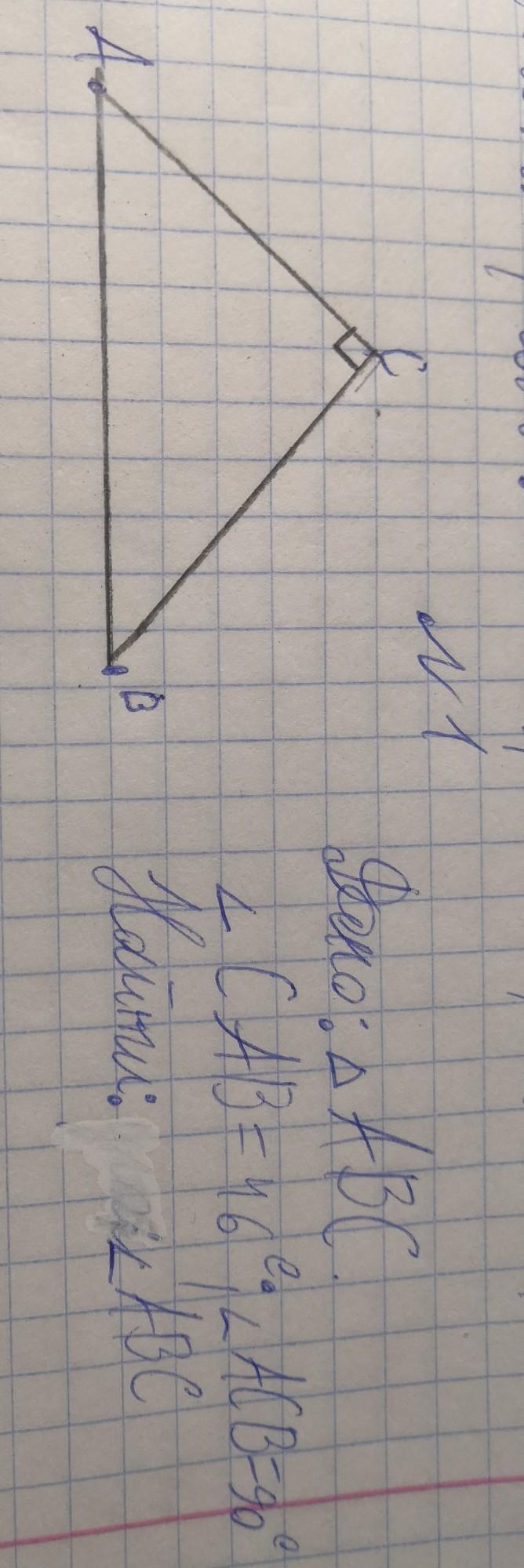 Углы треугольника в сумме дают 180°, по условию ACB = 90°, CAB = 46° => 180-90-46=44° угол ABC