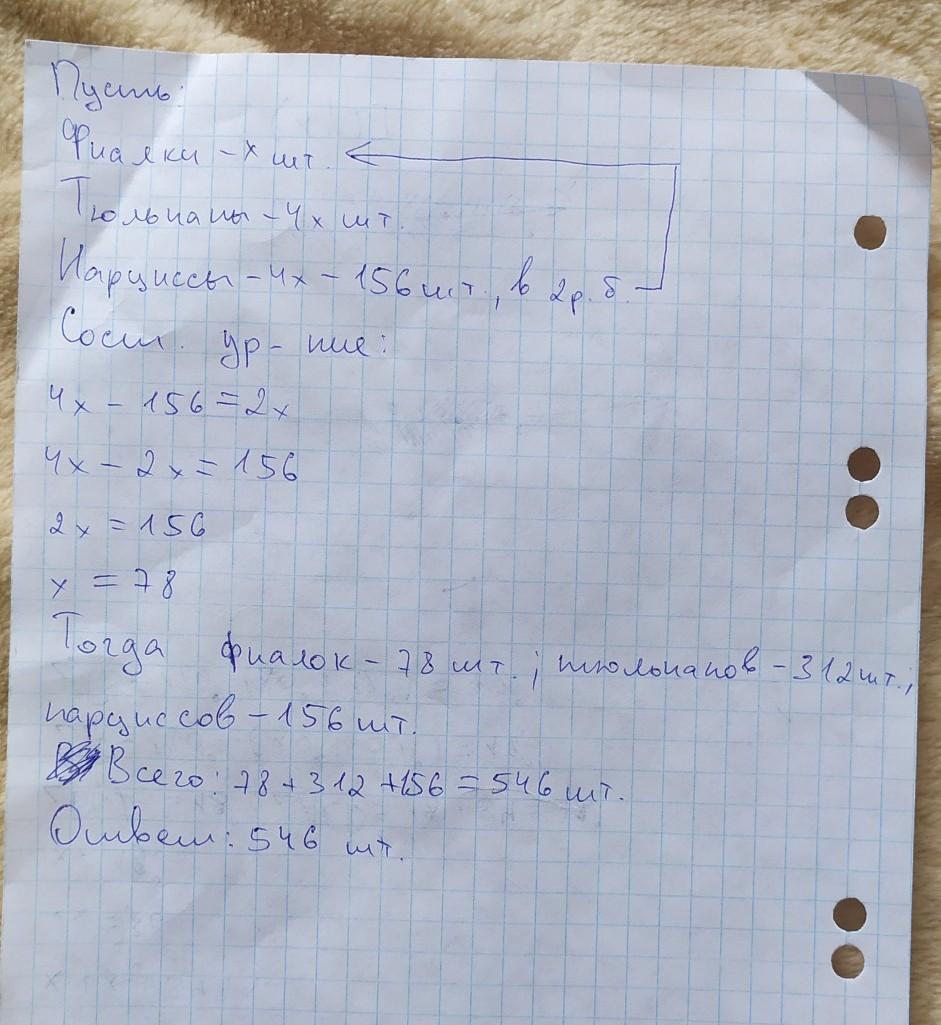 К празднованию дня Победы на клумбах у Вечного огня высадили весенние цветы: фиалки, нарциссы и тюльпаны. Фиалок было высажено в 4 раза меньше, чем тюльпанов. Нарциссов посадили на 156 меньше, чем тюльпанов, и их оказалось в 2 раза больше, чем фиалок. Сколько всего цветов было посажено?