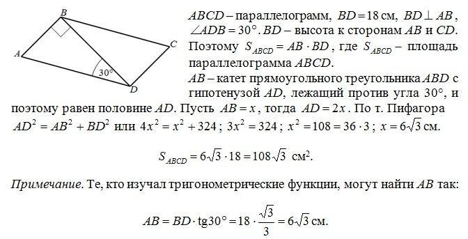 Діагональ паралелограма, яка дорівнює 18 см, перпендикулярна до однієї зі сторін і утворює кут 30 градусів із другою стороною. Знайдіть площу паралелограма.
