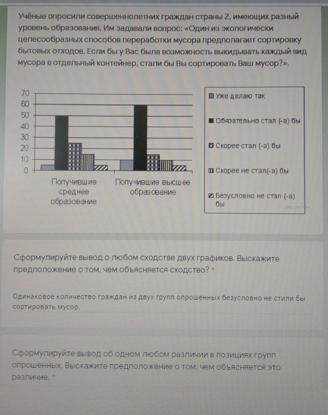 и чего тут не мочь, все просто есть две группы людей с средним образованием и с высшим и ты должен сказать чем их мнения(действия схожи и различны), подумай сам если, тк это задание из огэ то вероятно ты его сдаешь и ты сам должен научиться решать такие задания