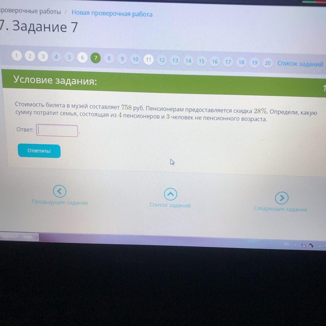 Стоимость билета в музей составляет 758 руб. Пенсионерам предоставляется скидка 28%. Определи, какую сумму потратит семья, состоящая из 4 пенсионеров и 3 человек не пенсионного возраста. Помогите