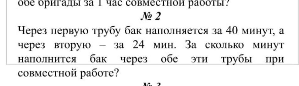 1) (возьмем наполнение всего бака за одну целую) 1 : 40 = 1/40 часть - бака может заполнить первая труба за одну минуту, так как она может заполнить весь бак за 40 минуты;