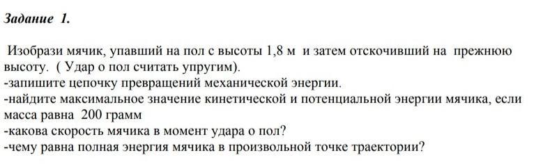 Изобрази мячик, упавший на пол с высоты 1,8м и затем отскочивший на прежнюю высоту. (Удар о пол считать упругим). -запишите цепочку превращений механической энергии. -найдите максимальное значение кинетической и потенциальной энергии мячика, если масса равна 200грамм -какова скорость мячика в момент удара о пол? -чему равна полная энергия мячика в произвольной точке траектории?