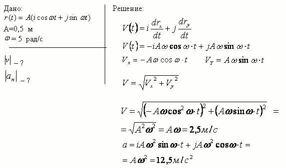Движение материальной точки задано уравнением r(t)=A(i cos ωt+j sin ωt), где А=0,5 м, ω=5 рад/с. Начертить траекторию точки. Определить модуль скорости |v| и модуль нормального ускорения An