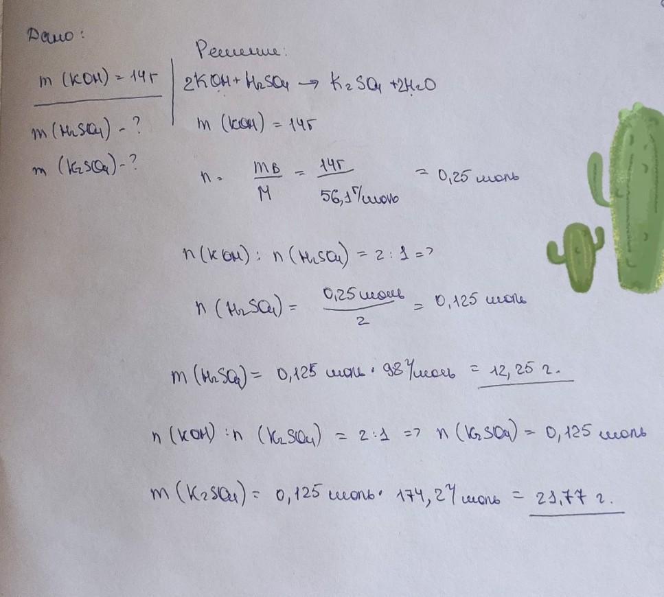 Гидроксид калия массой 14 г прореагировал с раствором серной кислоты. Вычислите массу кислоты, вступившей в реакцию, и массу образовавшейся соли.