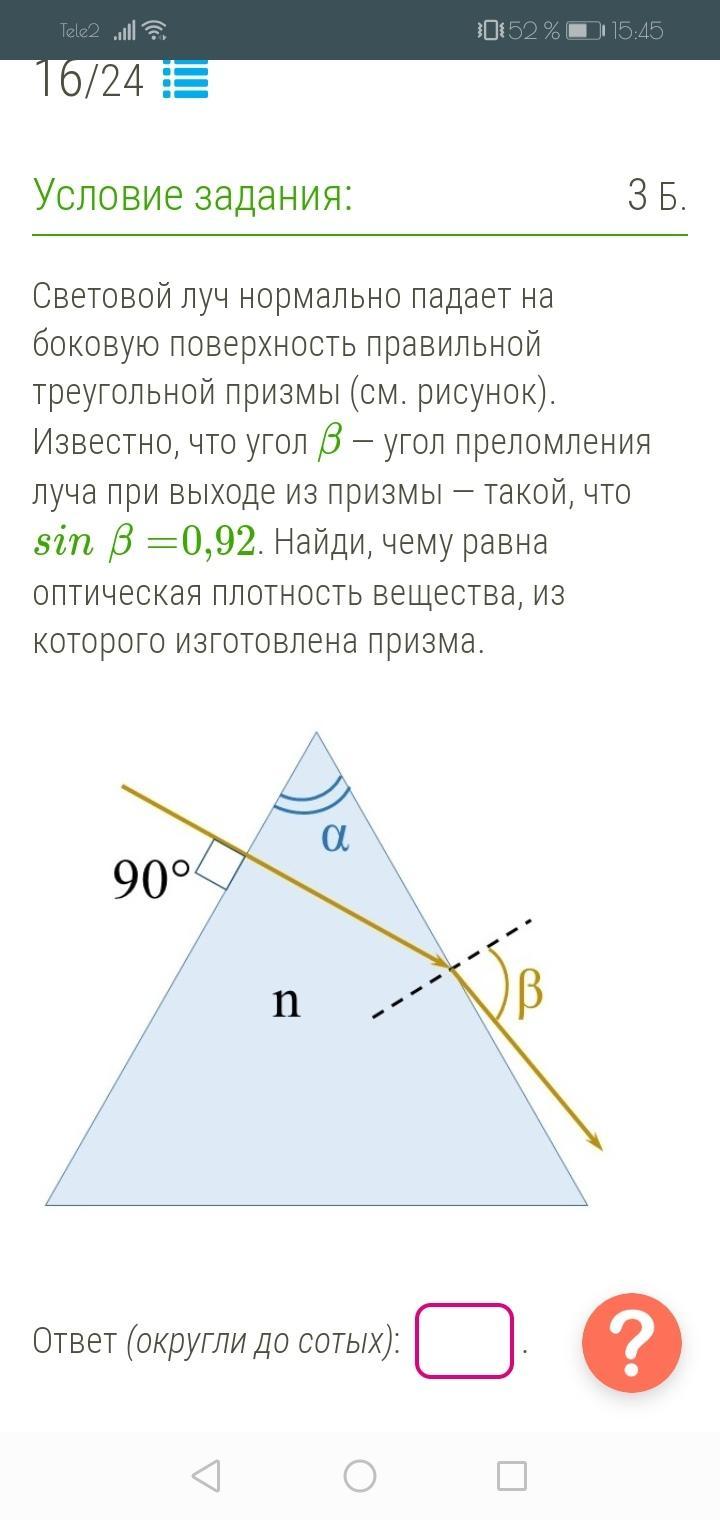 Световой луч нормально падает на боковую поверхность правильной треугольной призмы (см. рисунок). Известно, что угол β — угол преломления луча при выходе из призмы — такой, что sinβ=0,92. Найди, чему равна оптическая плотность вещества, из которого изготовлена призма.