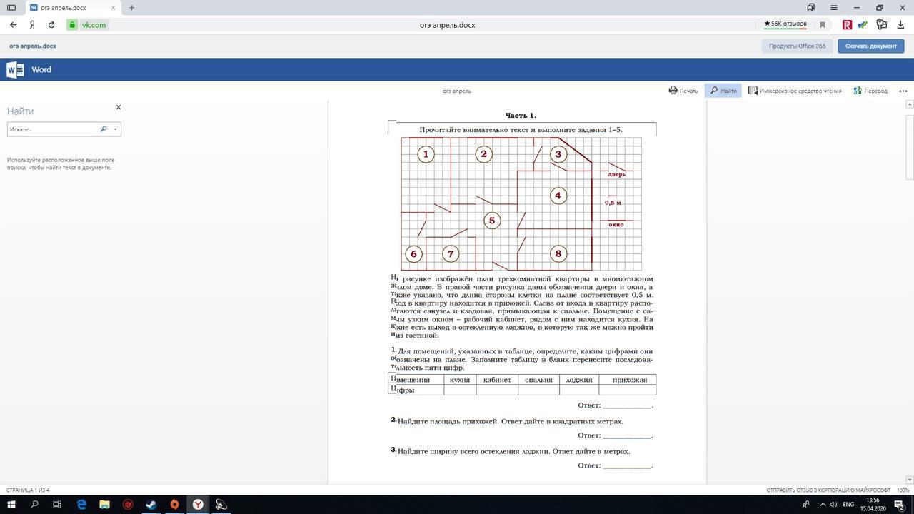 На рисунке изображён план трёхкомнотной квартиры в многоэтажном жилом доме. В правой части рисунка даны обозначения двери и окна, а также указано, что длина стороны клетки на плане соответствует 0,5 м. Вход в квартиру находится в прихожей. Слева от входа в квартиру располагаются санузел и кладовая, примыкающая к спальне . Помещение самым узким окном - рабочий кабинет ,рядом с ним находиться кухня. на кухне есть вход в остелённую лоджию ,в которую так же можно пройти из гостиной
