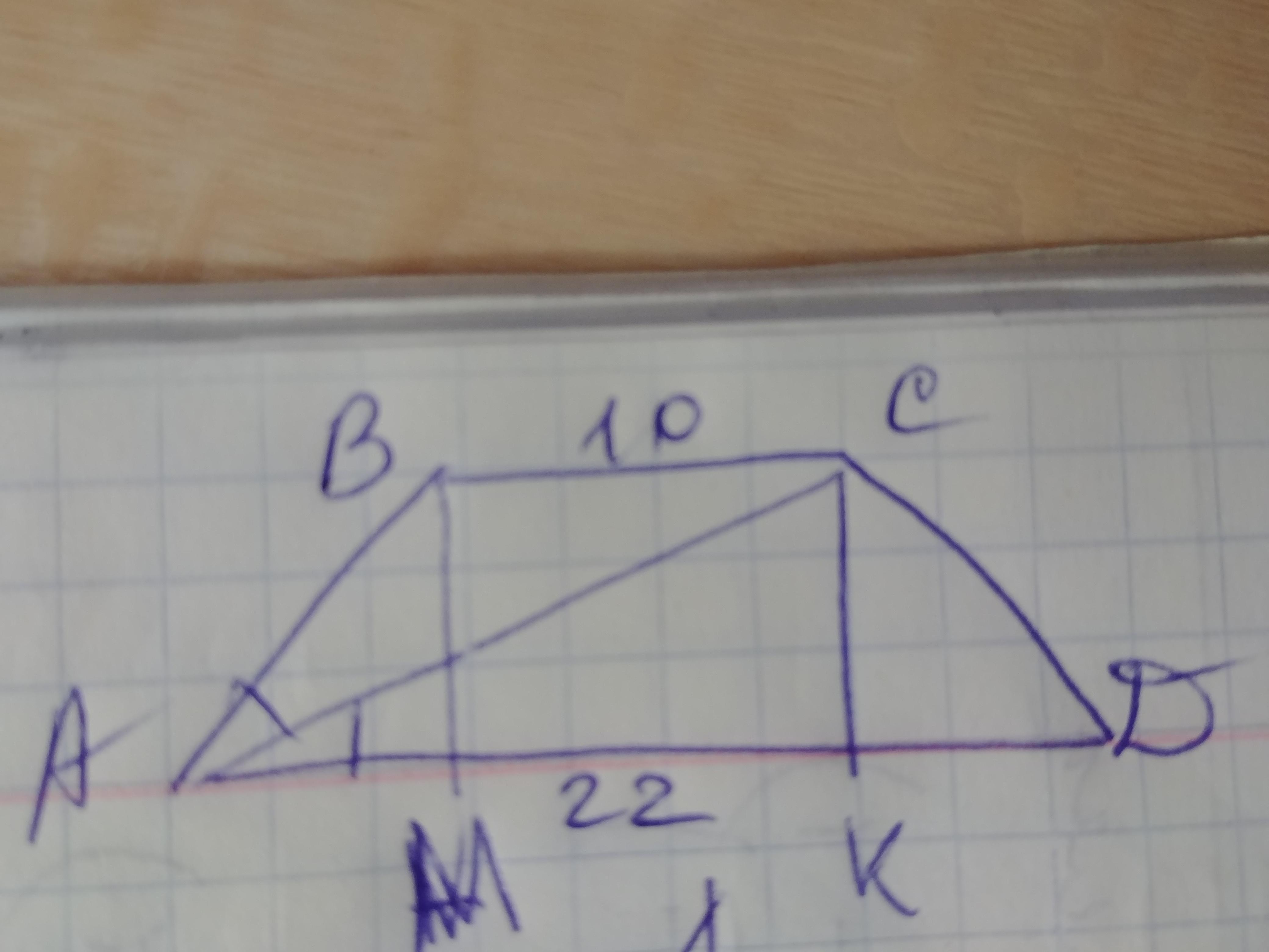 МК=10, значит АМ=МД=(22-10):2=6 см