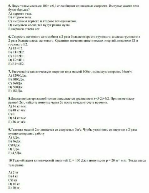 10. (mv²/2)/(mv)=100/20, v=2*5=10 м/c, m=20/10= 2кг (А)