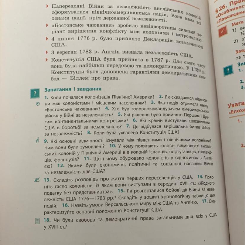 Ответ:1. 1519, 2.дуже погані , ті і ті готові були битися до кінця .6. Королівство Франції, Іспаньська імперія , Республіка Вермонт , Племена Індії , волонтери польщі . 7. Битва біля Банкер Хіла. 8 17 вересня 1787.