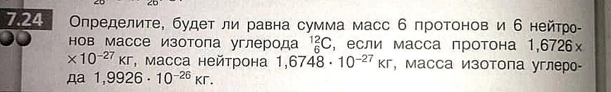 1.24 Определите, будет ли равна сумма масс 6 протонов и 6 нейтронов массе изотопа углерода 12С, если масса протона 1,6726*10^-27 кг, масса нейтрона 1,6748*10^-27 кг, масса изотопа углерода 1,9926*10^-26 кг.