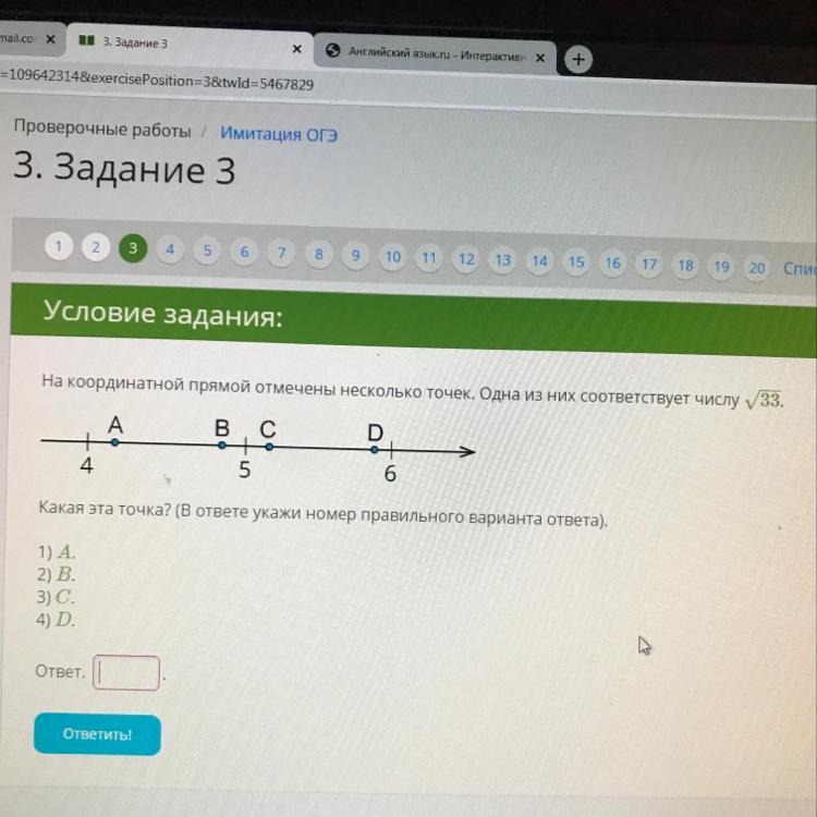 На. Координатной прямой отмечено несколько точек одна из них соответствует числу корень из 33 какая это. В ответе укажи номер правильного ответа