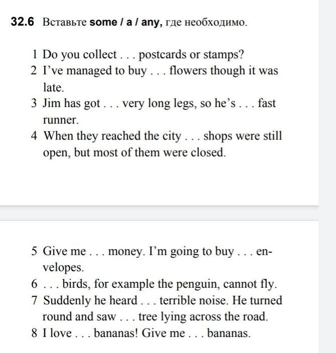 Ответ: 1)any 2)some 3)-,a 4)some 5)some,some 6)Any 7)a,a 8)-,some