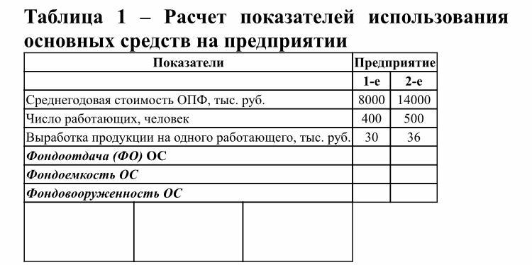 Определить показатель фондоотдачи и фондовооруженности для каждого предприятия. Сделайте вывод, на каком из предприятий лучше используются основные фонды. Результаты расчетов оформить в таблицу 1.