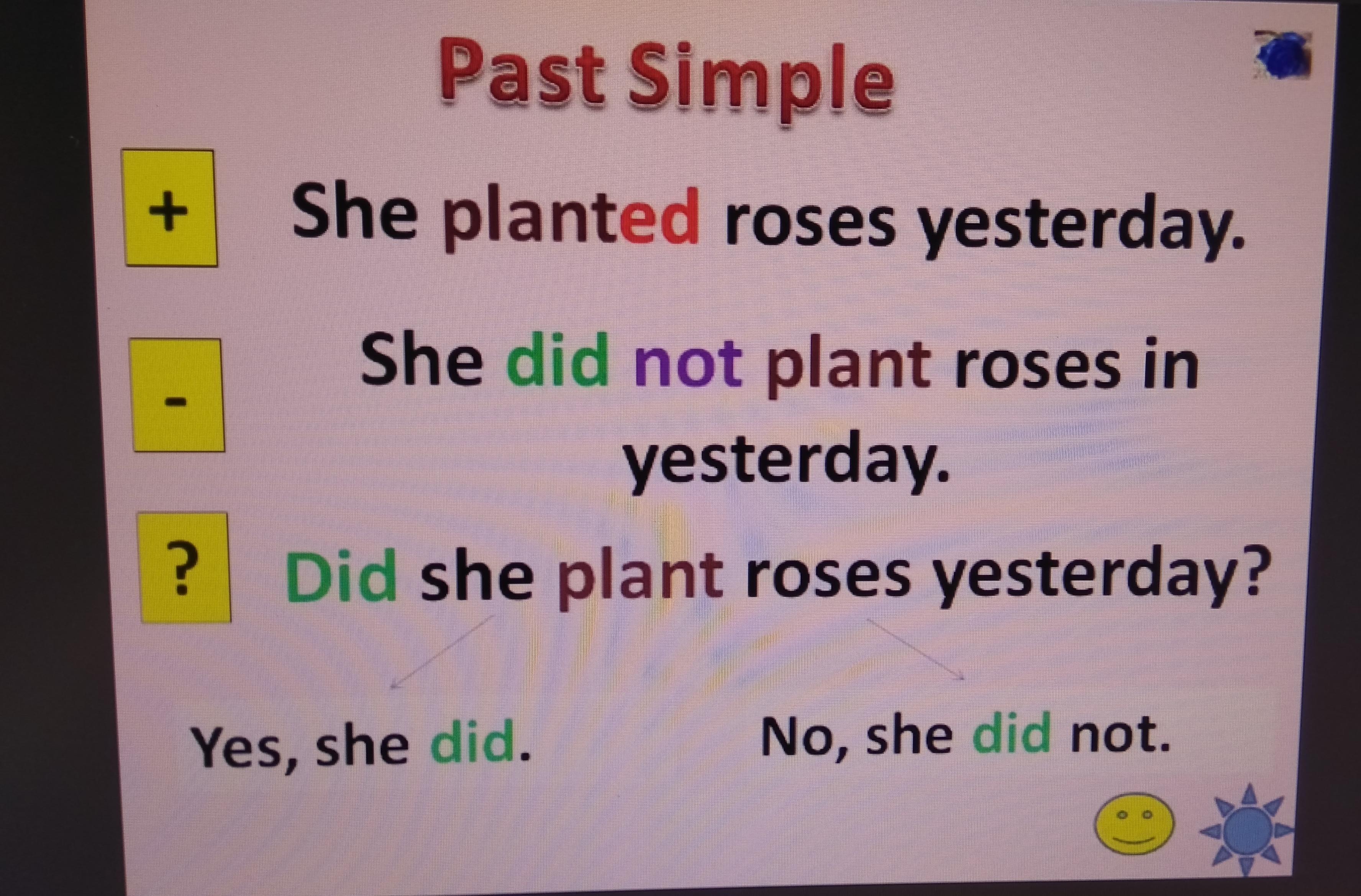 I visited London last year. Did I visit London last year? I did not visit London last year. You cleaned your room yesterday. Did you clean your room yesterday? You did not clean your room yesterday. She decorated her class yesterday. Did she decorate her class yesterday? She did not decorate her class yesterday. We lived in the village last year. Did we live in the village last year? We did not live in the village last year. They played tennis last week. Did they play tennis last week? They did not play tennis last week.