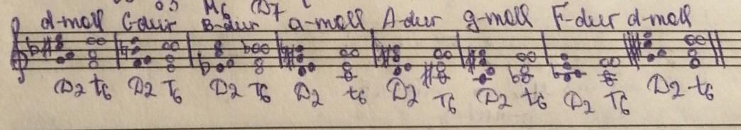 Д.з. Постройте нисходящую секвенцию по родственным тональностям ре минора: D2-T6.