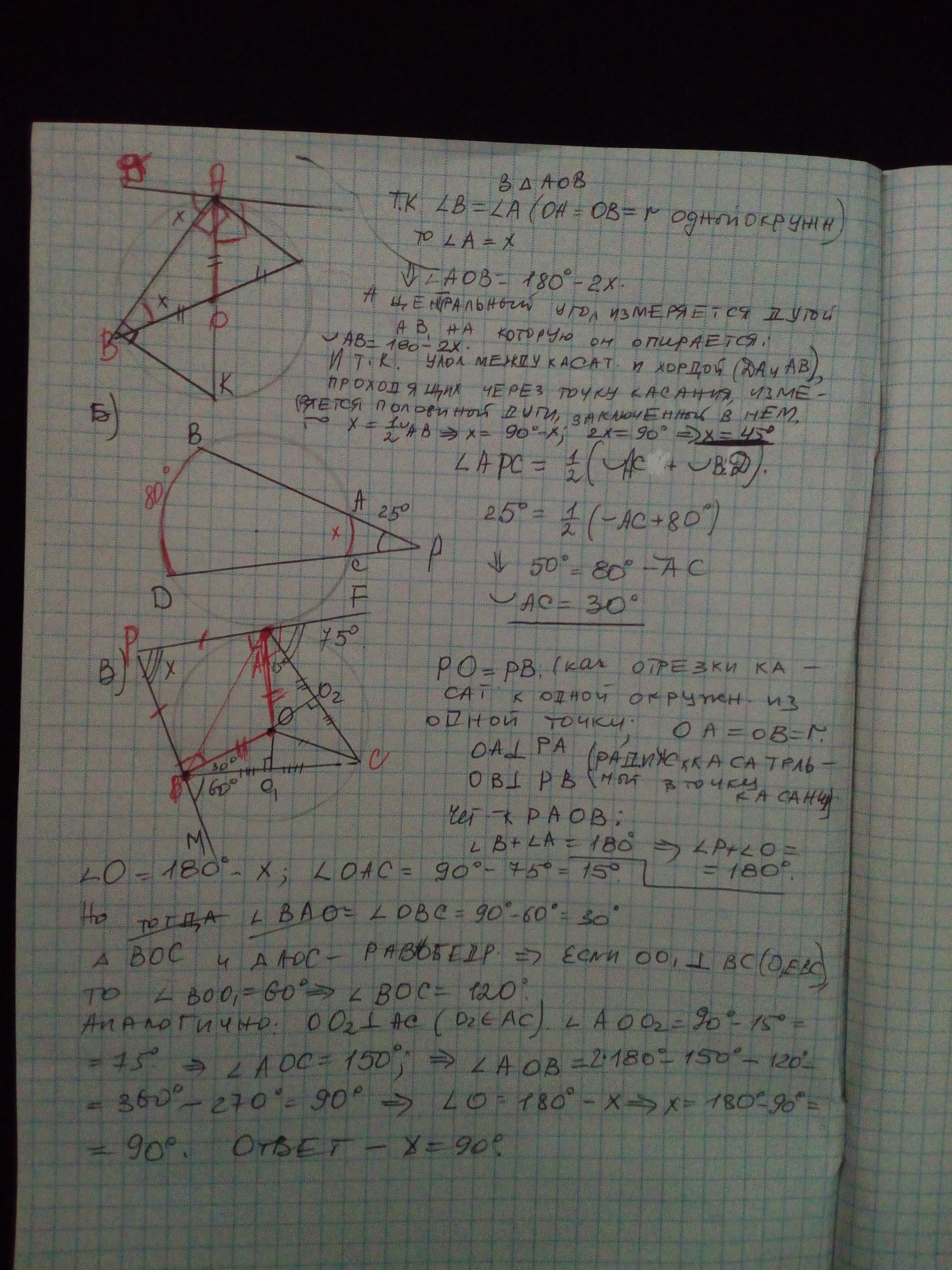 ∠х+∠ВАО=90° и ∠х=∠ВАО=45°