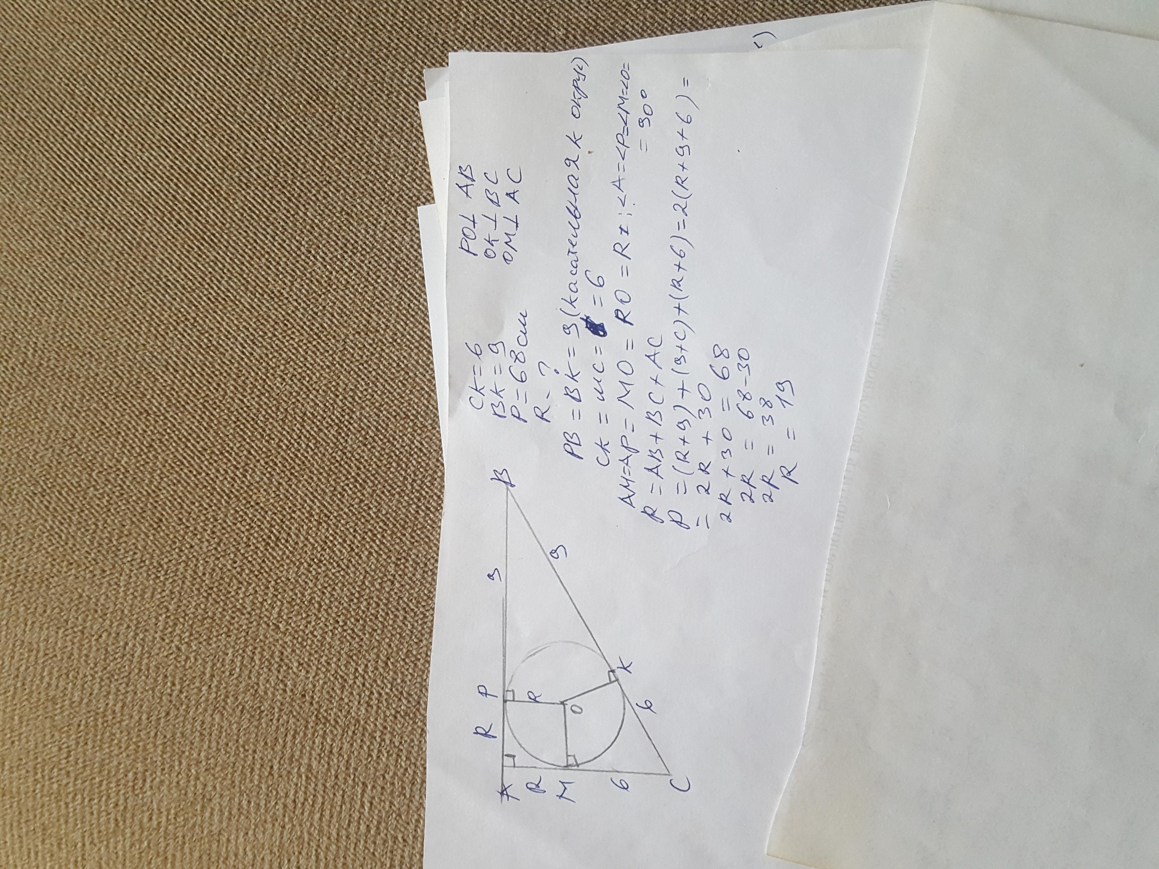 В прямоугольном треугольнике точка касания вписанной окружности делит гипотенузу на отрезки 6 см и 9 см. найдите радиус окружности, если периметр треугольника равен 68 см