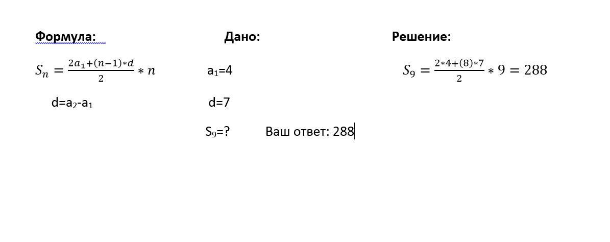 Найдите сумму девяти первых членов арифметической прогрессии 4;11; …