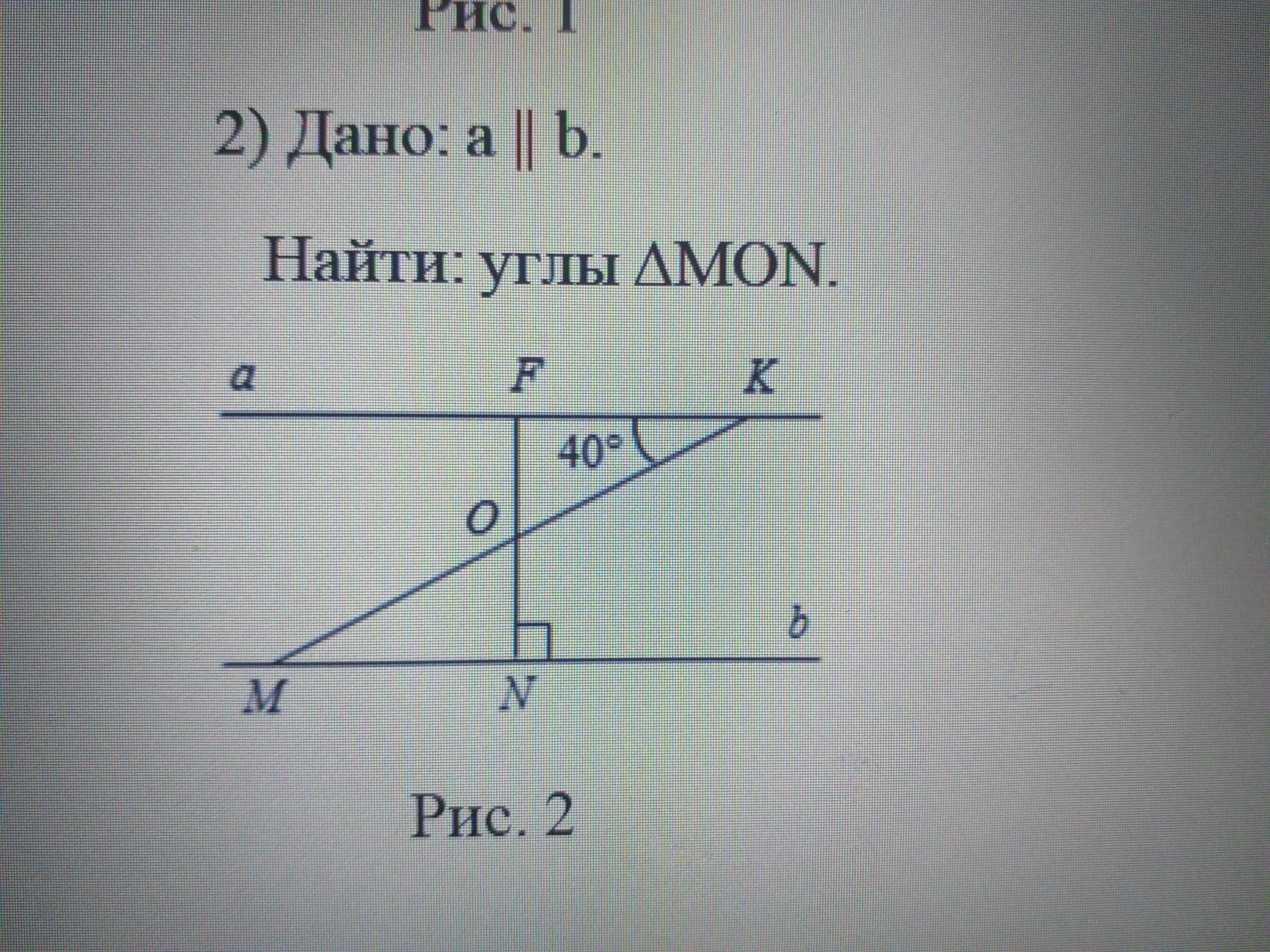 ∠OMN = ∠OKF = 40° — как накрест лежащие при параллельных прямых a и b и секущей MK