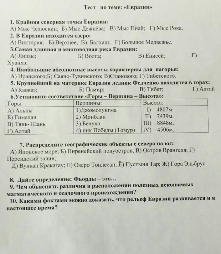 6. Альпы- Монблан- 4807; Гималаи- Джомолунгма- 8848; Алтай- Белуха - 4506; Тянь-Шань- пик Победы - 4807