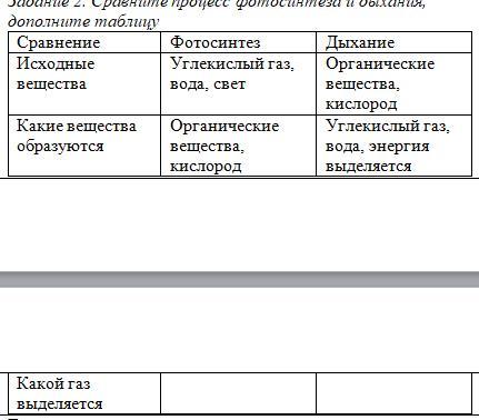 Задание 2. Сравните процесс фотосинтеза и дыхания, дополните таблицу