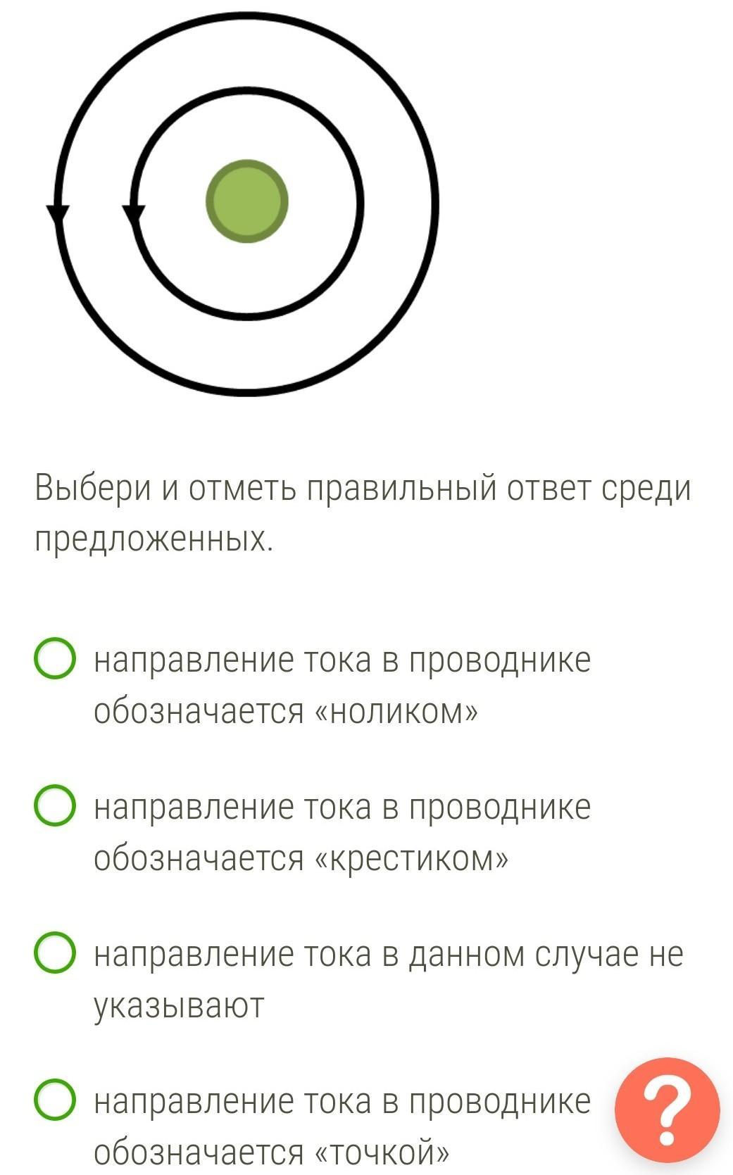 Для прямого проводника с током, изображенного на рисунке, стрелками задано направление линий магнитного поля. Определи, каким образом на рисунке должно быть обозначено направление тока в проводнике.