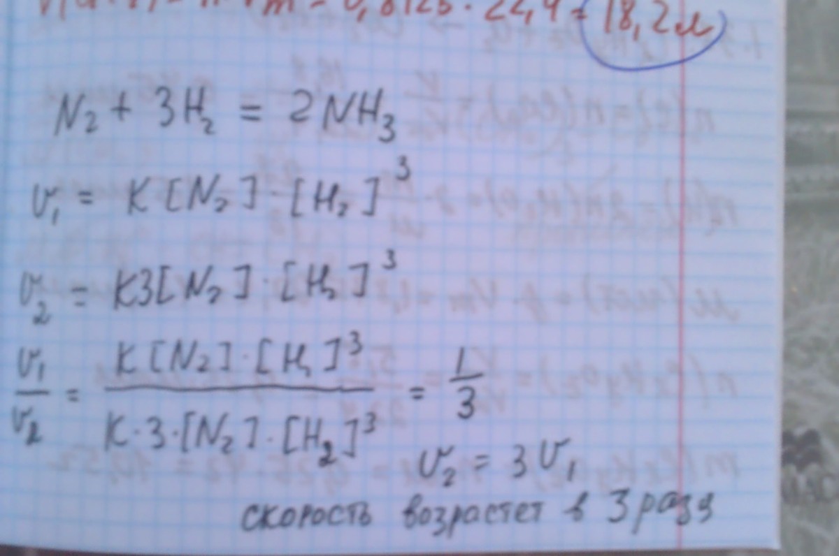 Как изменится скорость реакции N2+3H2=2NH3,если концентрацию N2 увеличить в три раза?