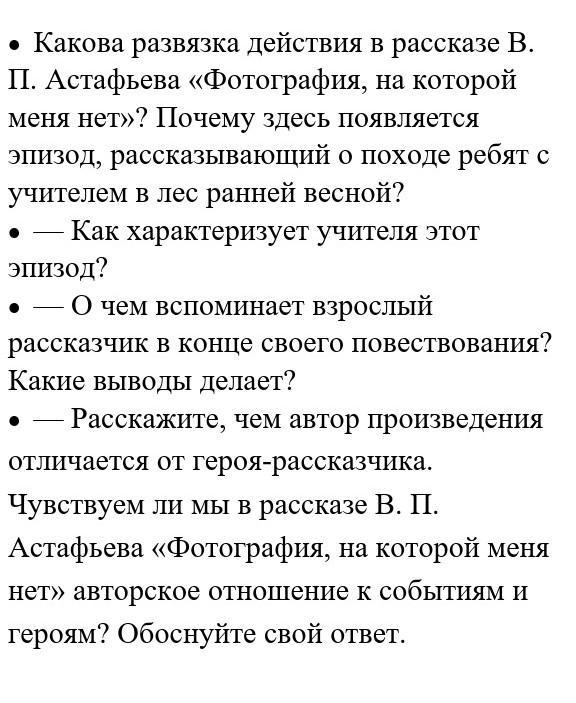 • Какова развязка действия в рассказе В. П. Астафьева «Фотография, на которой меня нет»? Почему здесь появляется эпизод, рассказывающий о походе ребят с учителем в лес ранней весной?