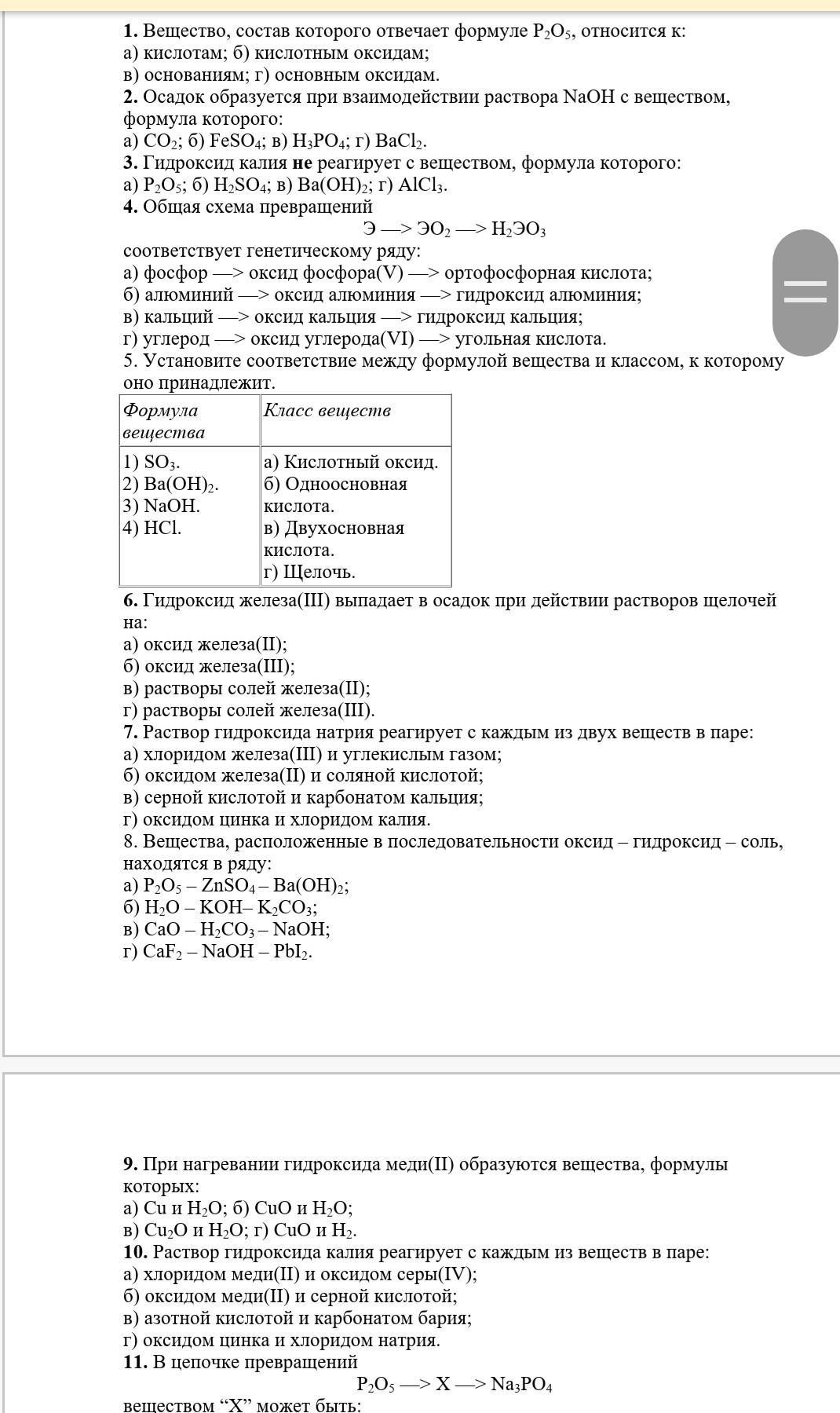 1. Вещество, состав которого отвечает формуле P2O5, относится к: